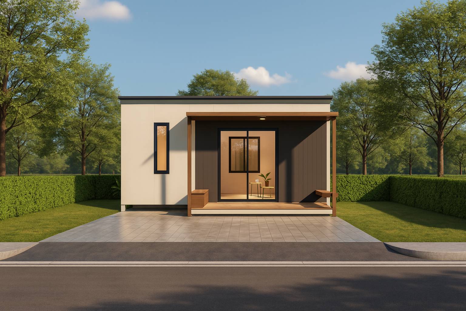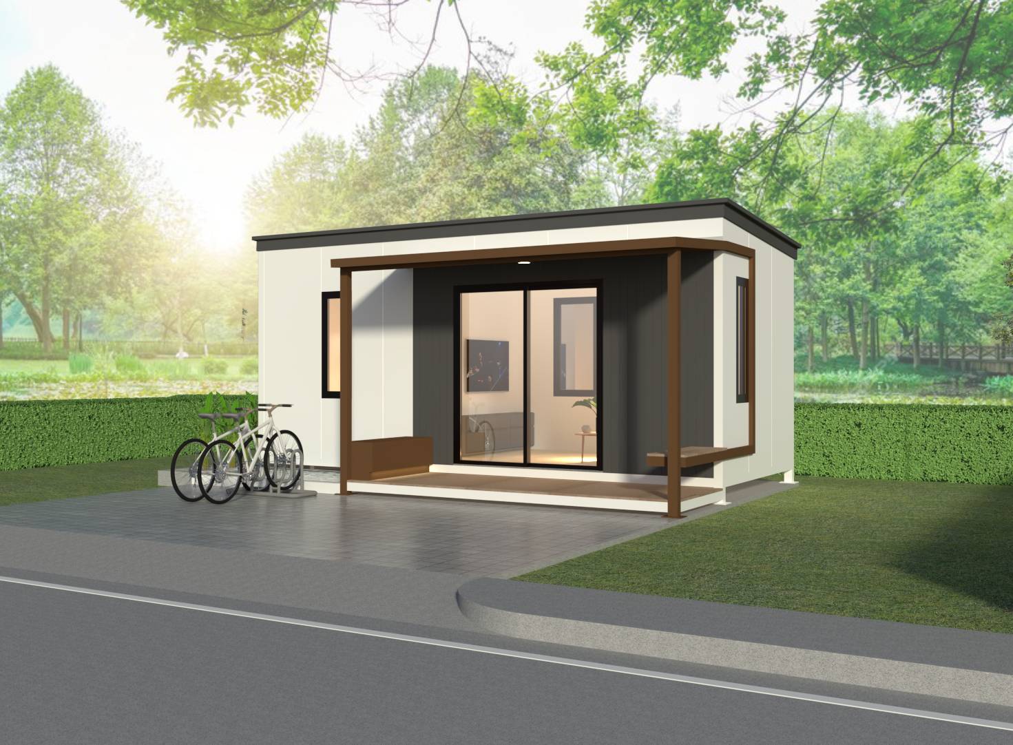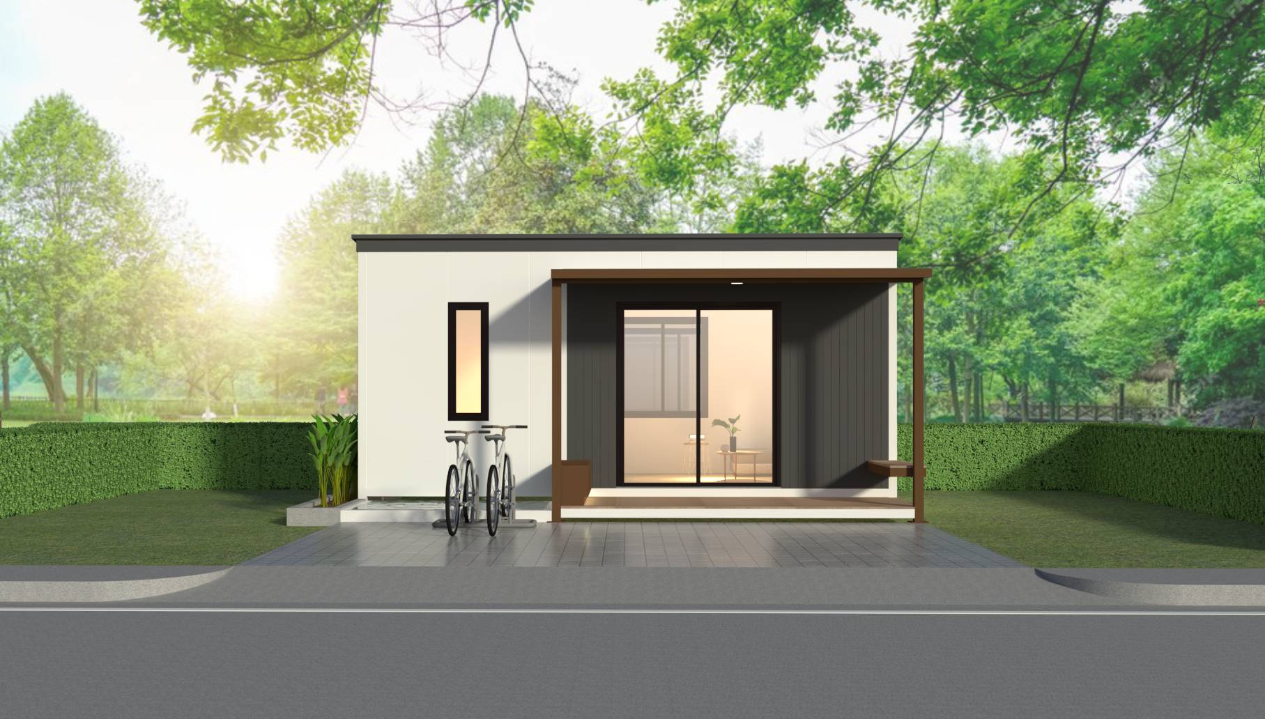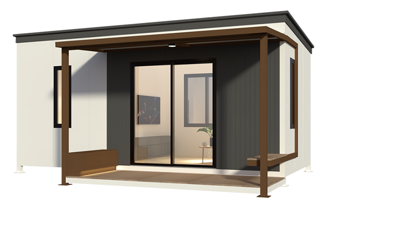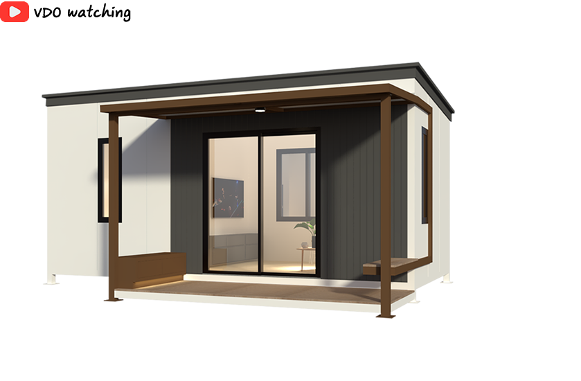 บ้านน็อคดาวน์สำเร็จรูป Monster M-B4 บ้านสไตล์โมเดิร์น ตอบโจทย์ทุกความต้องการของชีวิตทันสมัย รูปทรงสีเหลี่ยม 1 ห้องนอน , 1 ห้องนั่งเล่น , 1 ห้องน้ํา เน้นที่ความเรียบง่ายของรูปทรงและจัดพื้นที่ใช้สอยให้ได้ประโยชน์สูงสุด โทนสีแสดงถึงความสงบและสบายตา ไม่มีความฉูดฉาด ดูสุขุมมั่นคง สีขาว น้ําตาลลายไม่ ดูมีความเป็นเป็นธรรมชาติ มีระเบียงส่วนหน้าเป็นตัวเชื่อมภายนอกบ้านและภายใน