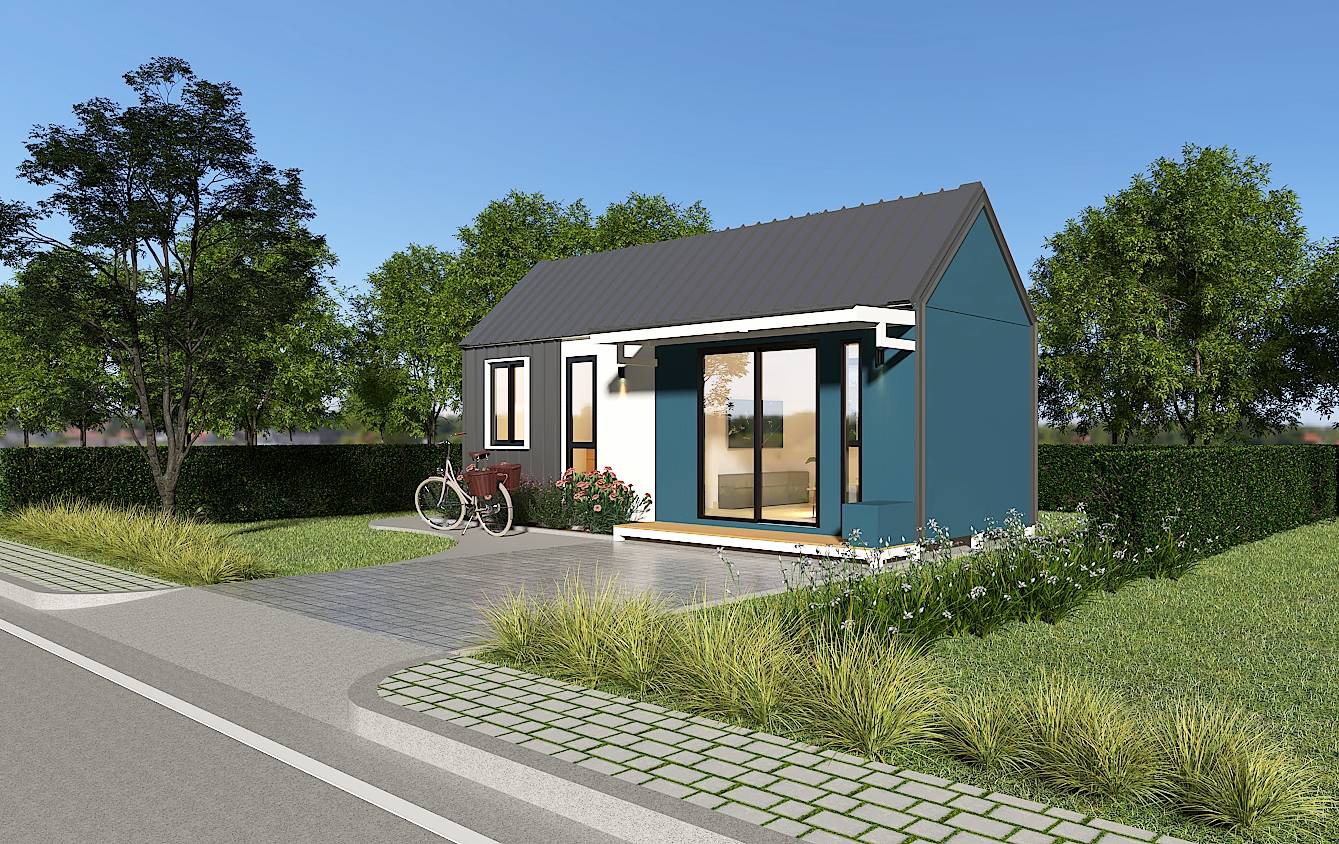 บ้านน็อคดาวน์สำเร็จรูป Monster M-B6 บ้านสไตล์โมเดิร์น ตอบโจทย์ทุกความต้องการของชีวิตทันสมัย รูปทรงสีเหลี่ยม 1 ห้องนอน /ห้องนั่งเล่น , 1 ห้องน้ํา, 1 ห้องครัว หลังคาทรงจั่ว ฝ้าสูง ระบายอากาศได้ดี โทนสีขาวและสีน้ําเงินเข้มแสดงถึงความทันสมัย สร้างความโดดเด่นและสะดุดตาได้มากขึ้น ผนังลอนเมทัลชีทตัดกับผนังไฟเบอร์ซืีเมนต์เพิ่มความน่าสนใจของ texture ผนังยิ่งขึ้น