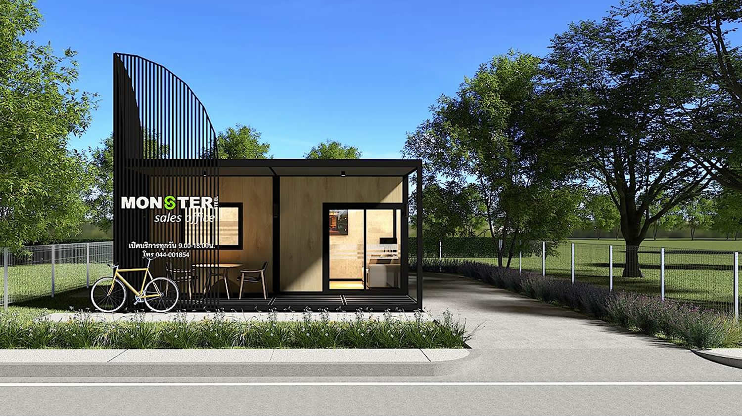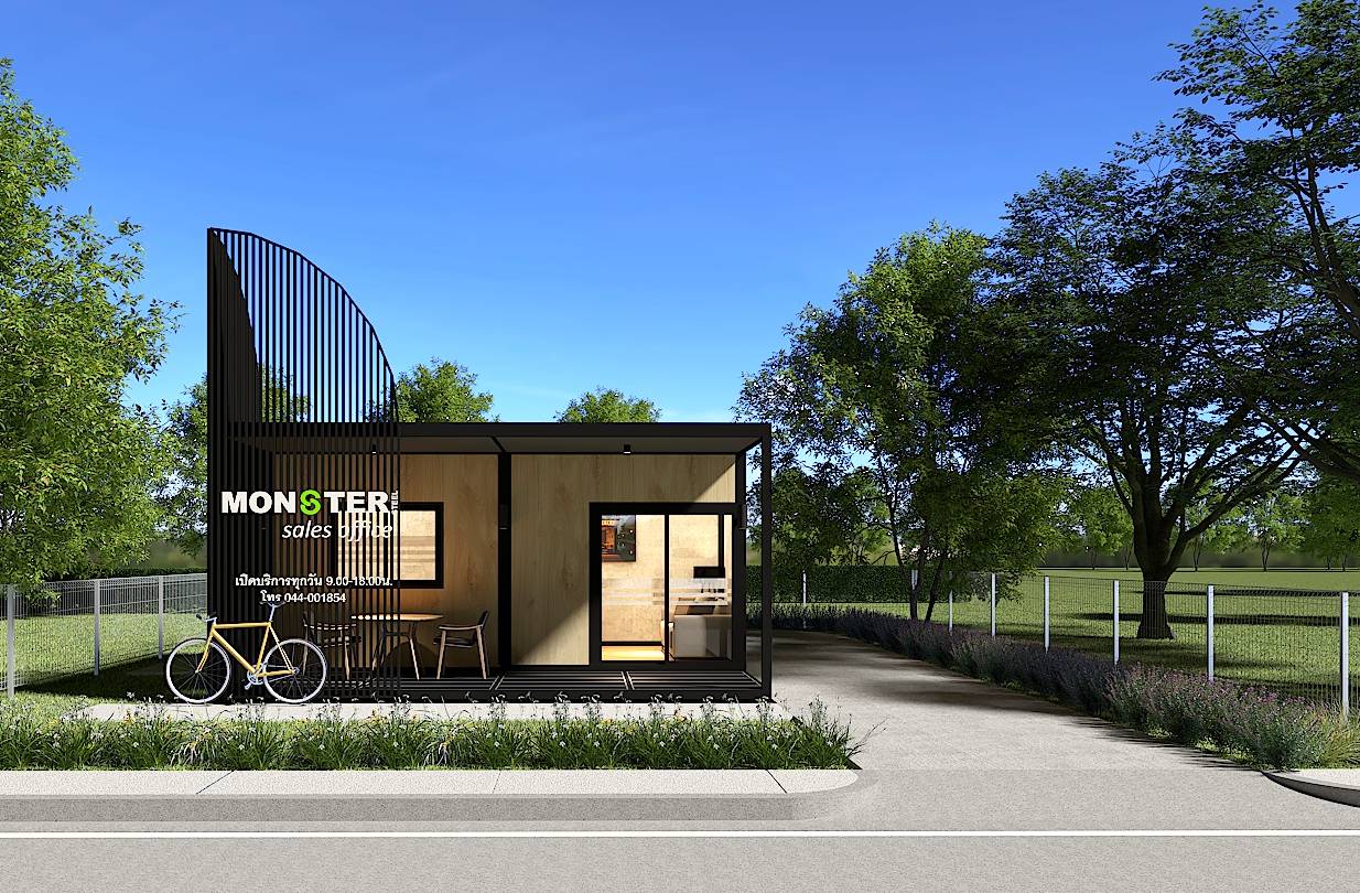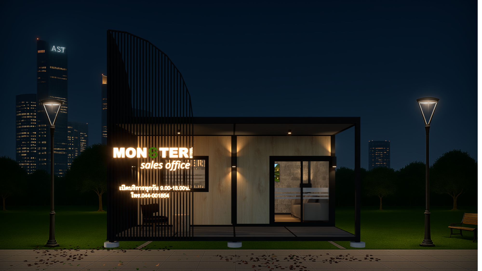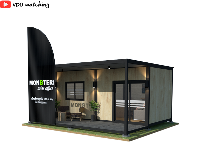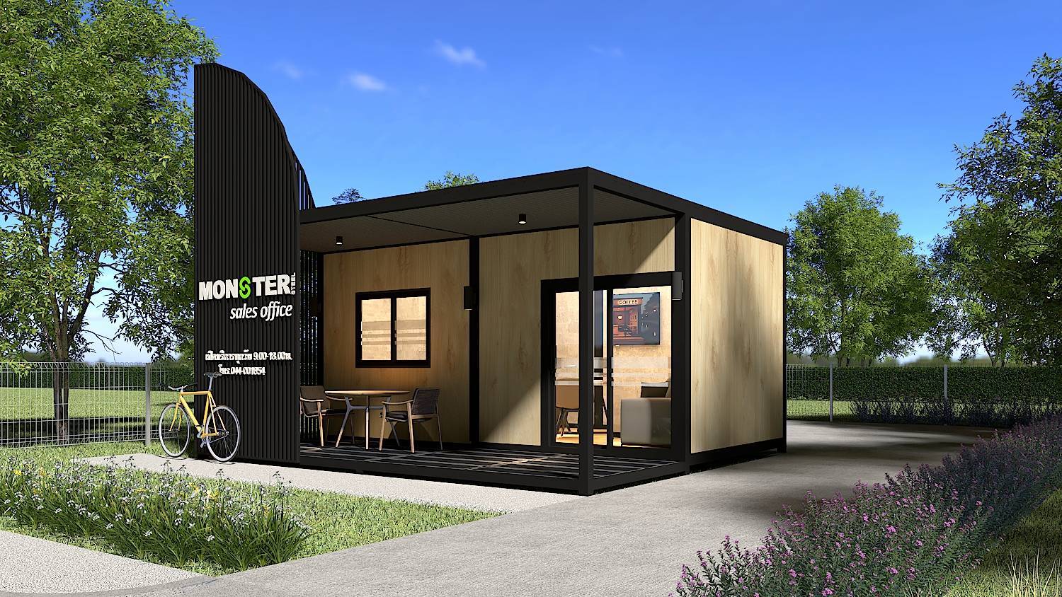 สํานักงานขาย & ออฟฟิศ สำเร็จรูป สไตล์โมเดิร์นลอฟท์  Monster S-A1  ผนัง Sandwich Panel ลายไม้ ให้ลุคอบอุ่นแบบธรรมชาติ แต่ยังคงความโมเดิร์น กระจกบานใหญ่และพื้นทีเปิดโล่ง ช่วยให้แสงธรรมชาติเข้าถึงภายในออฟฟิศ ลดการใช้พลังงานไฟฟ้า ให้ความรู้สึกโปร่งสบาย ไม่อึดอัด